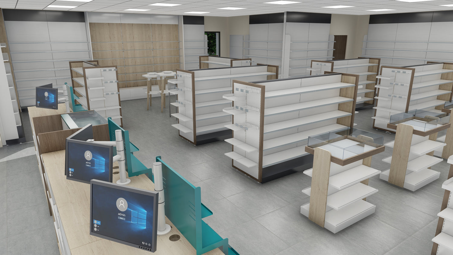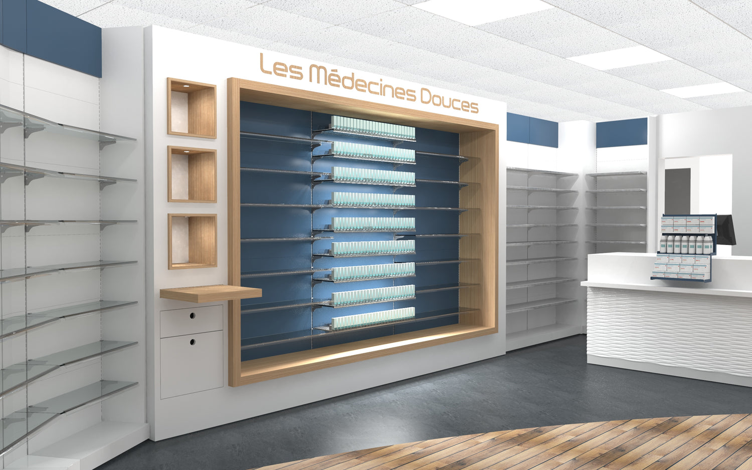 Conception d’un mobilier respectant la charte graphique représentant l’identité de la Pharmacie.