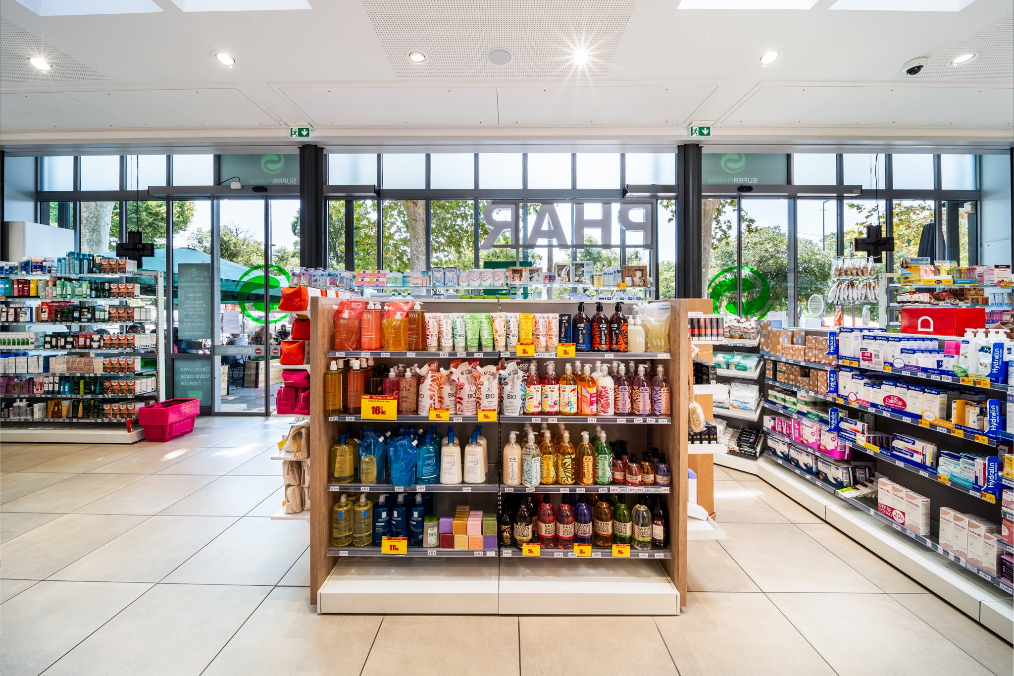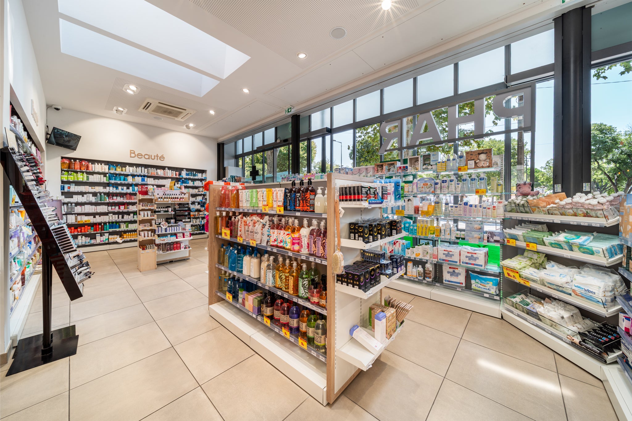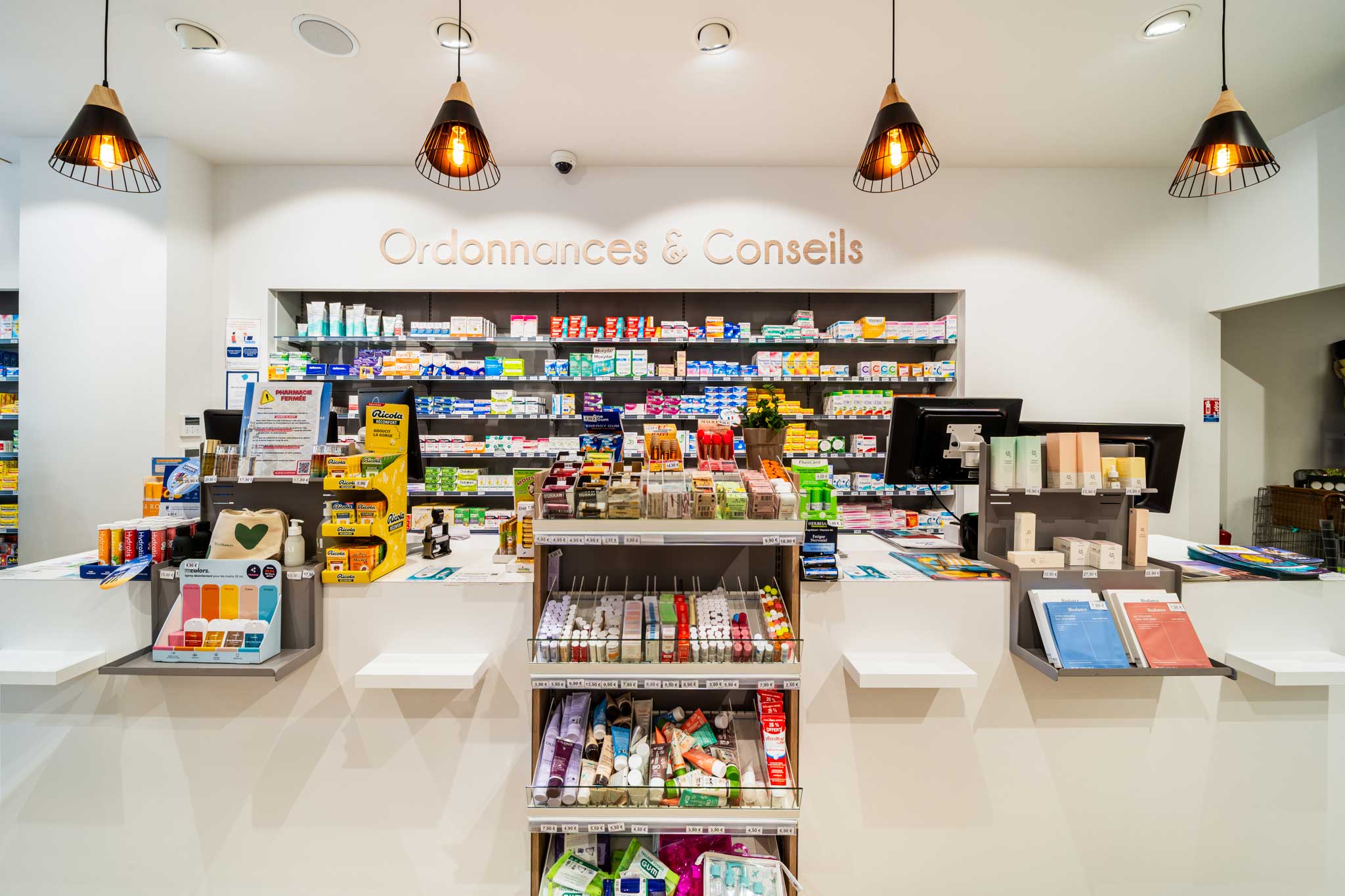 Nous avons exploité les niches murales existantes en y intégrant notre mobilier. Les meubles sans fond ont été privilégiés en façade permettant de voir la pharmacie de l’extérieur depuis cette avenue très fréquentée.
