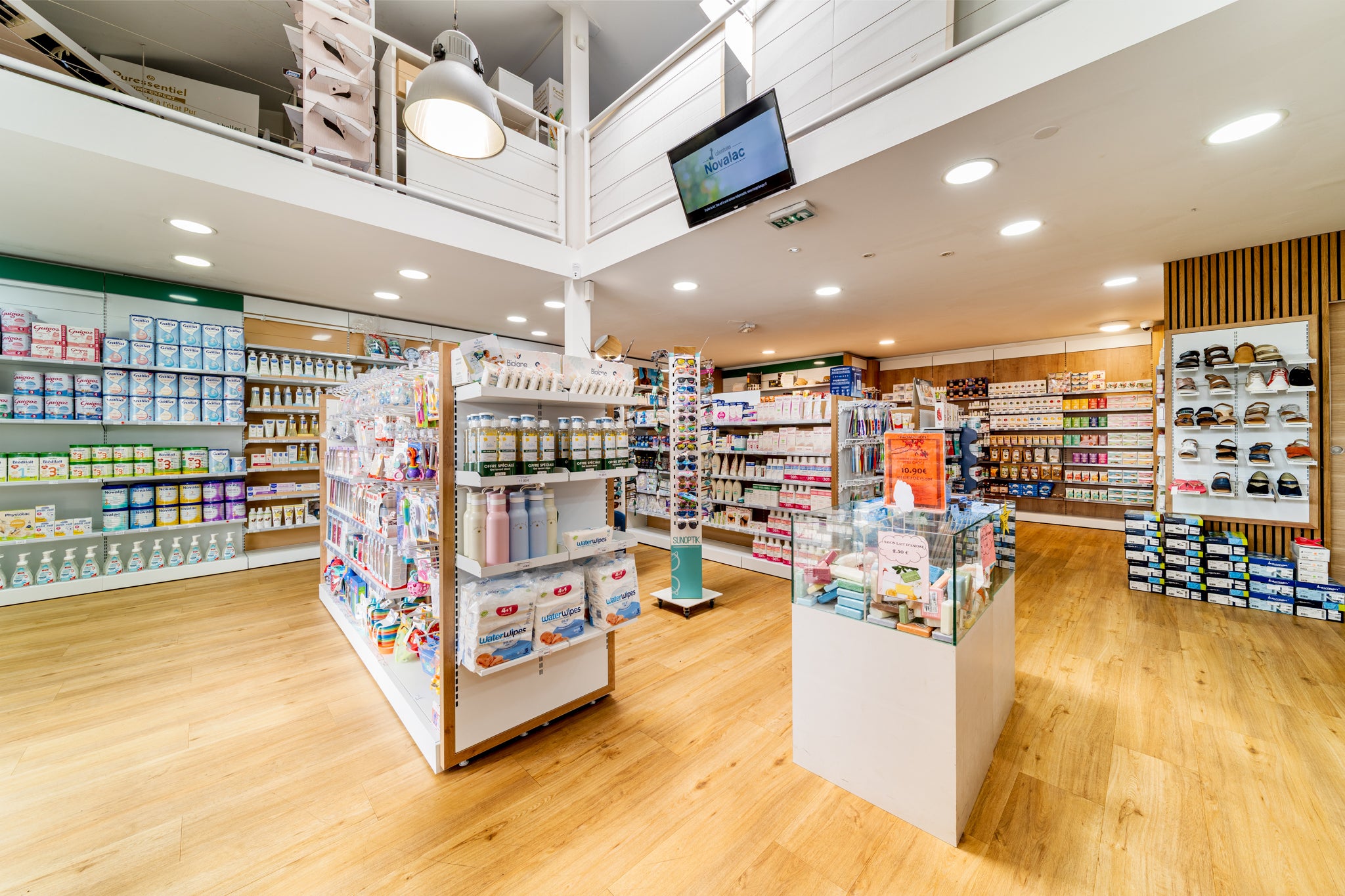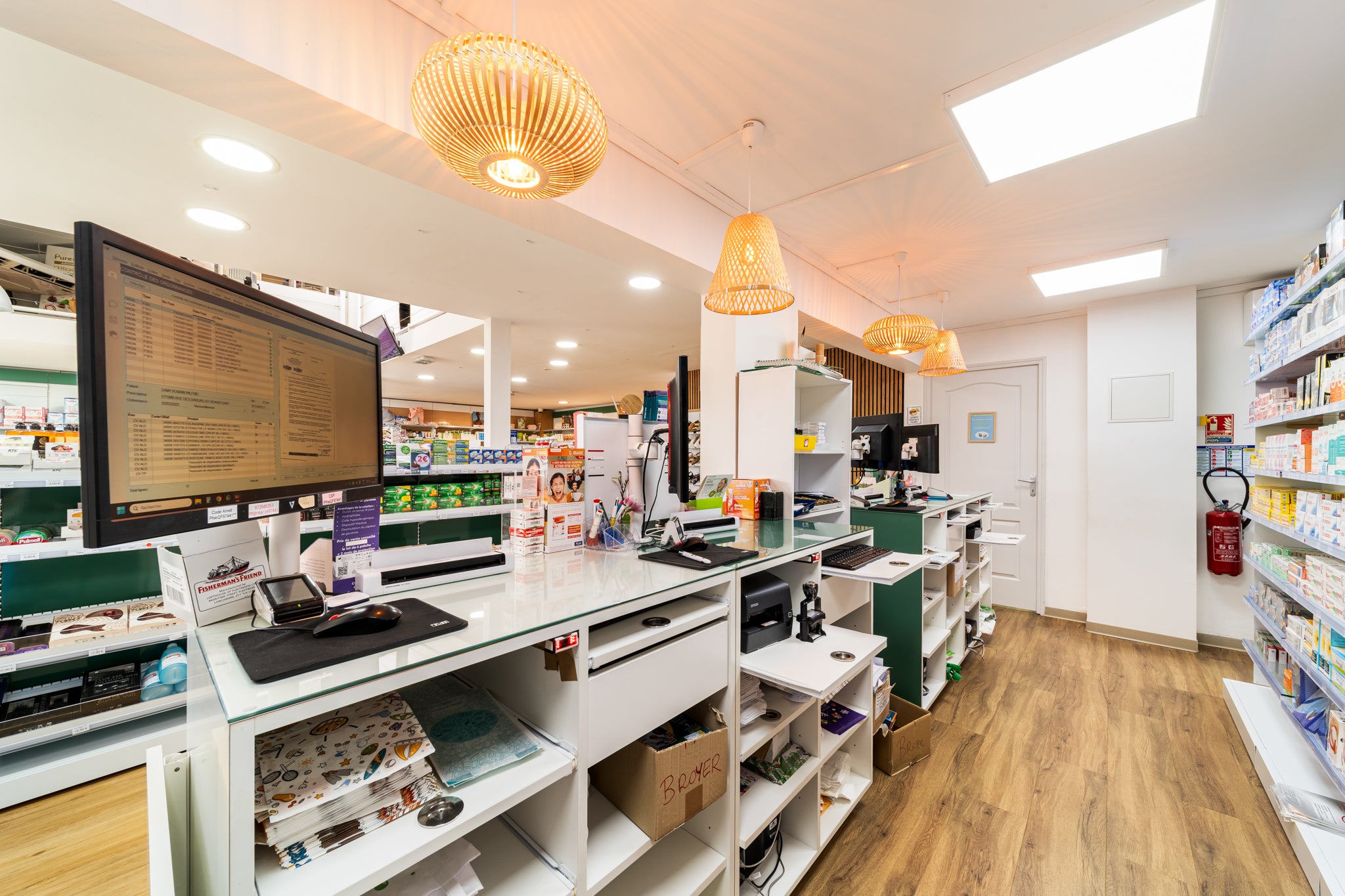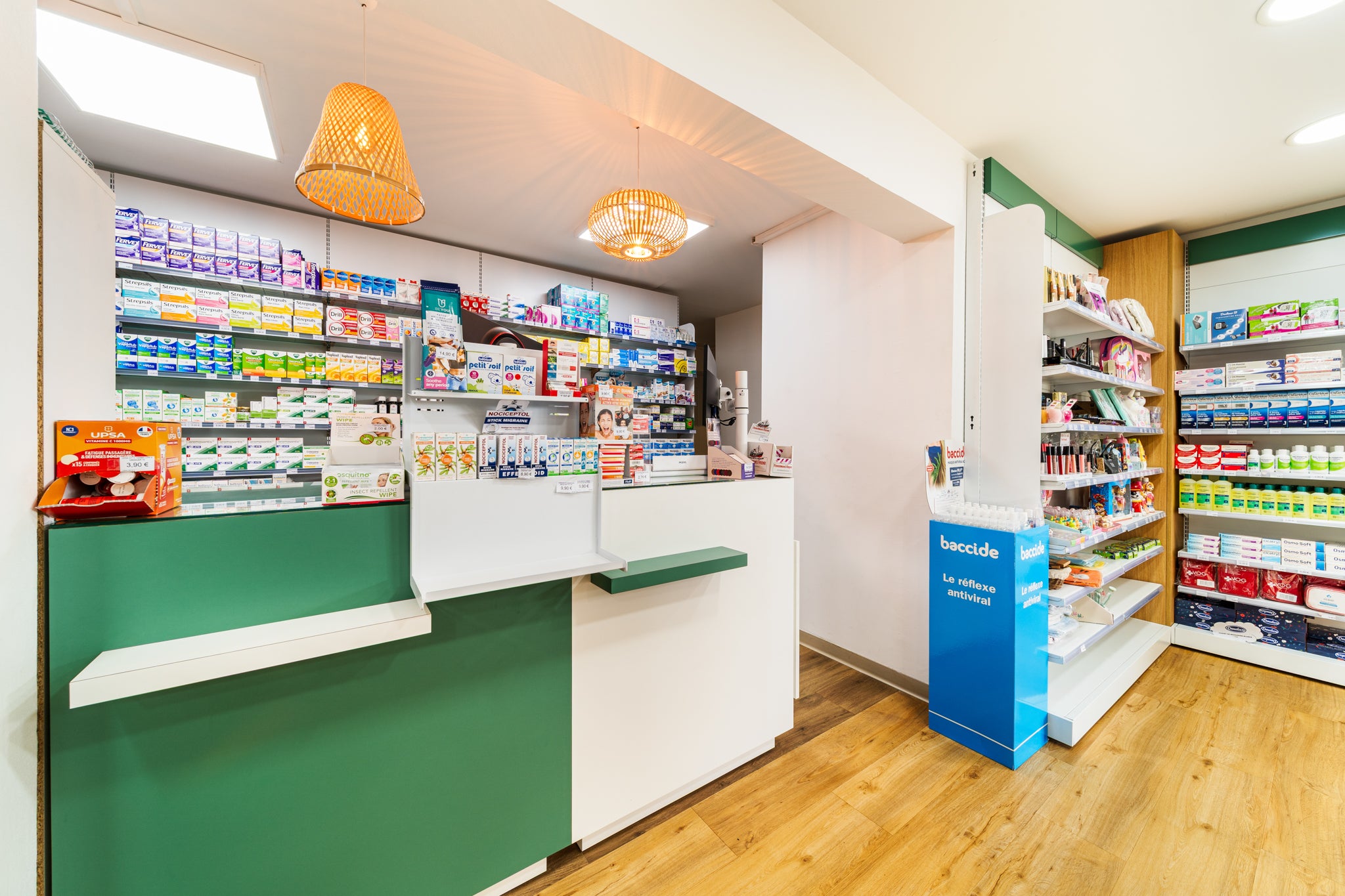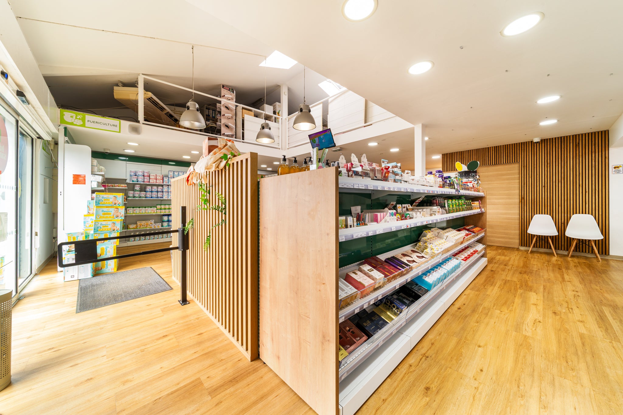À Sainte-Suzanne, EspaceMag signe la métamorphose de la pharmacie Quartier Français. Un projet global d’agrandissement et de mise aux normes (zone orthopédie & HPST), optimisé par un agencement fluide et sans zone froide, ainsi qu’une valorisation de l’étage.