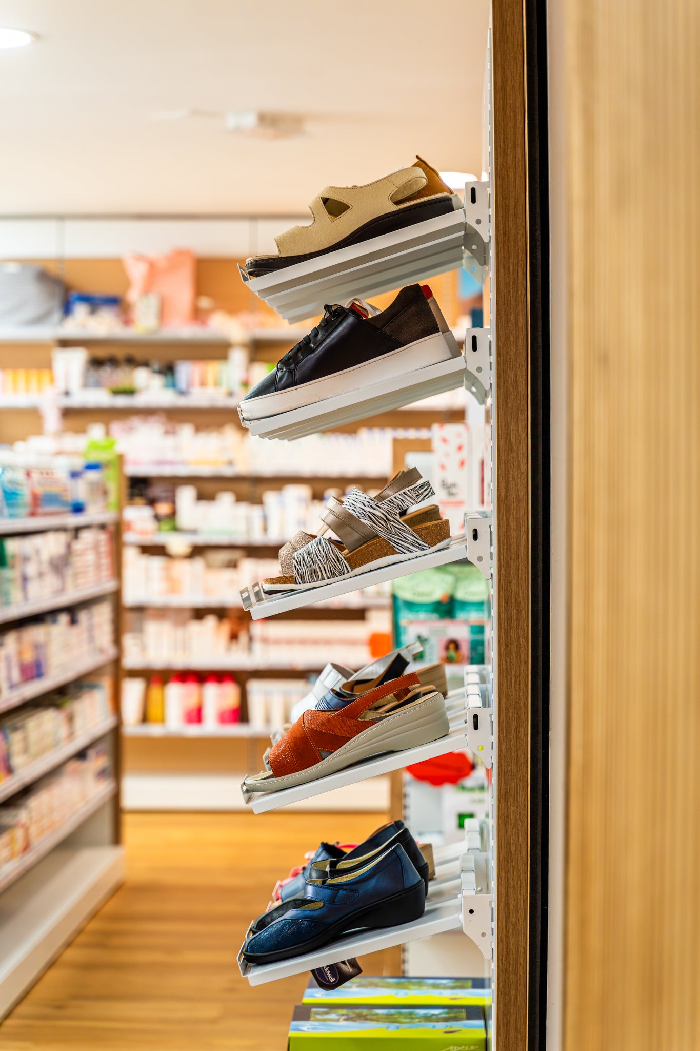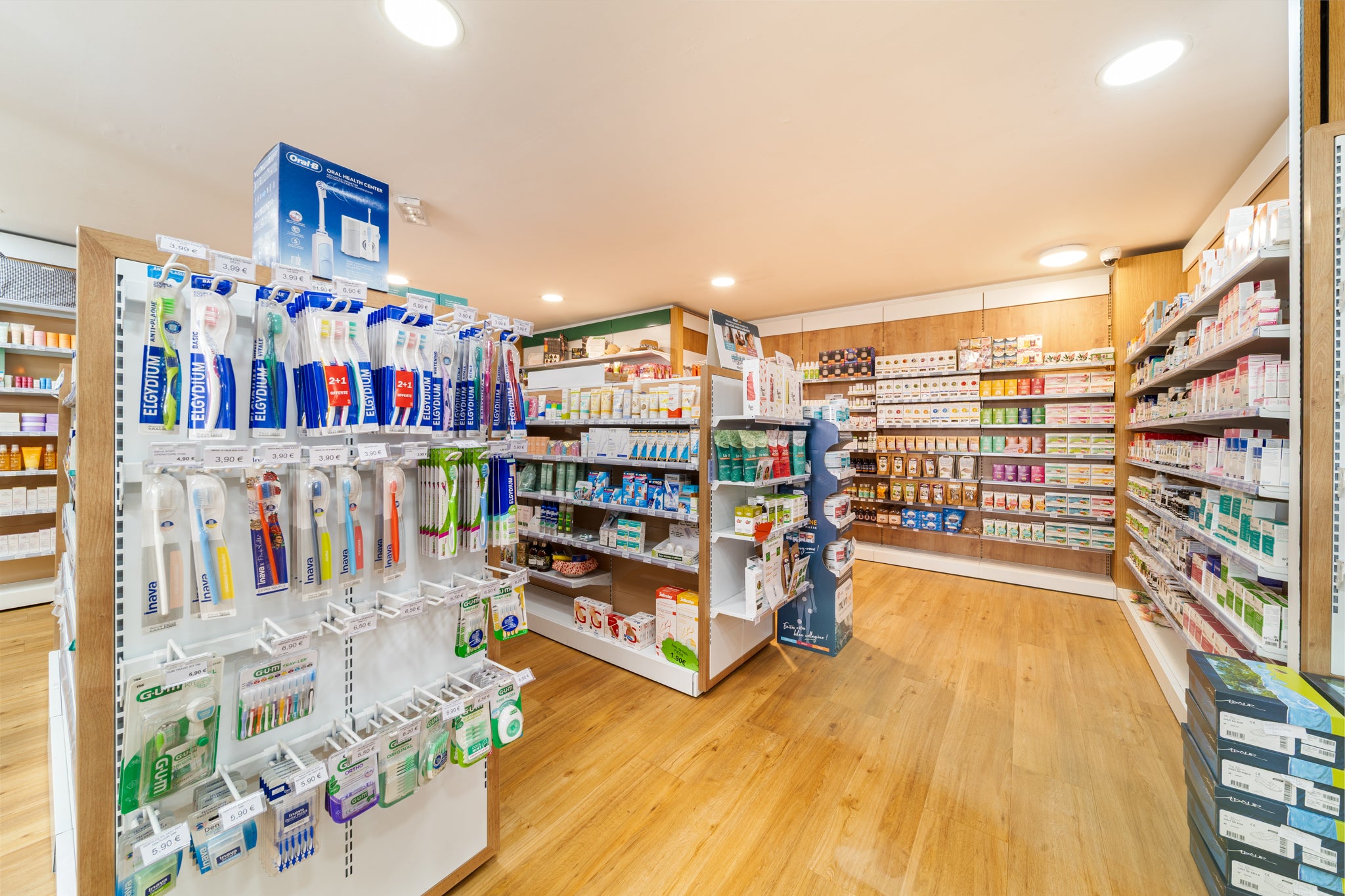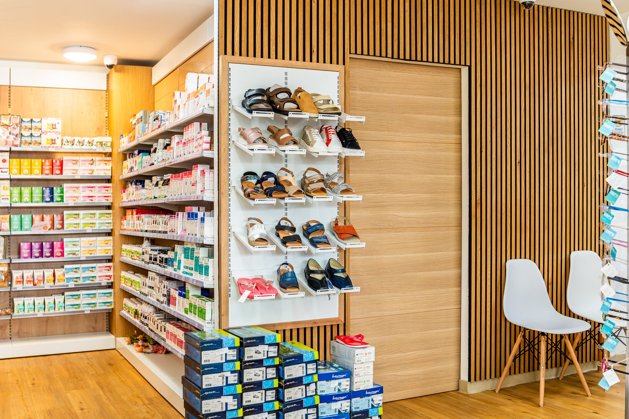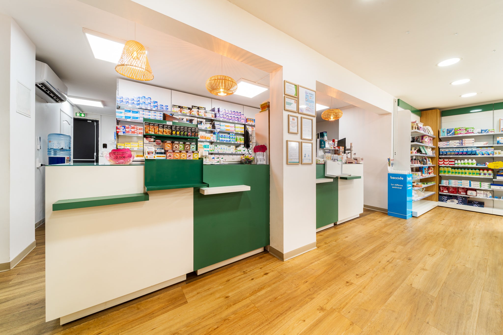 À Sainte-Suzanne, EspaceMag signe la métamorphose de la pharmacie Quartier Français. Un projet global d’agrandissement et de mise aux normes (zone orthopédie & HPST), optimisé par un agencement fluide et sans zone froide, ainsi qu’une valorisation de l’étage.